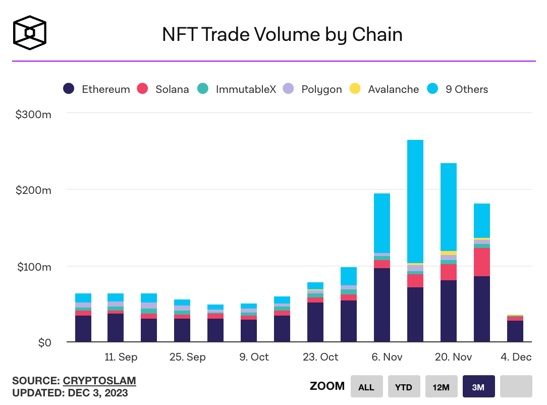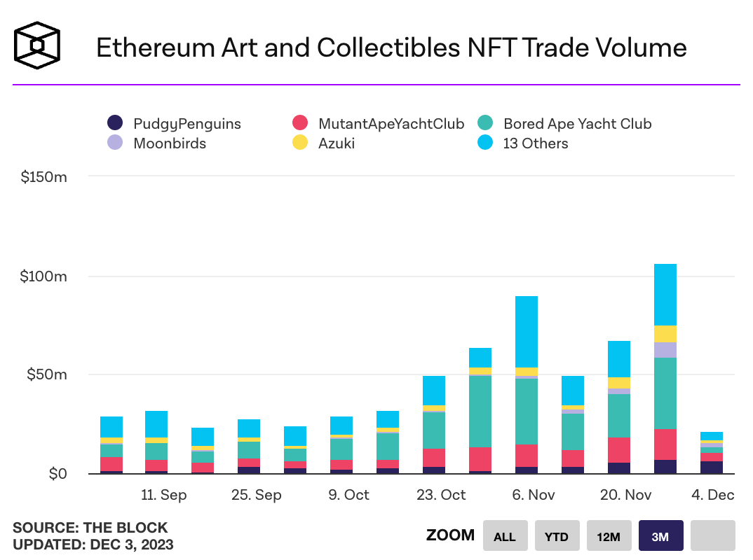 - November saw $605 million in NFT trading on Ethereum, up from $306 million in October. December NFT trading volume has already reached $90 million month-to-date, with nearly $70 million of that volume coming from transactions on the Blur NFT marketplace. Link.