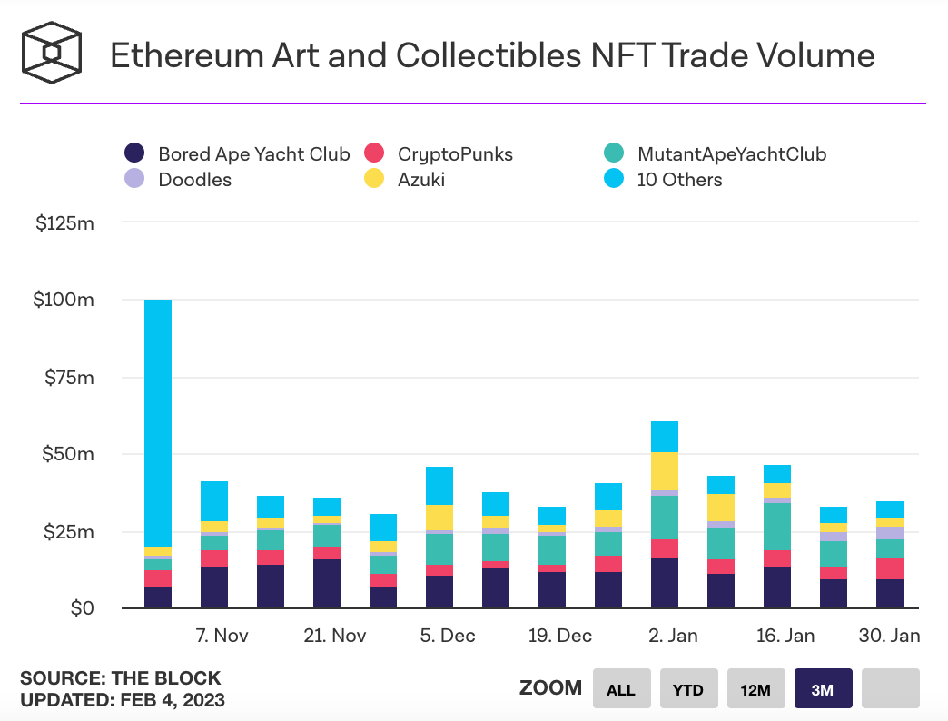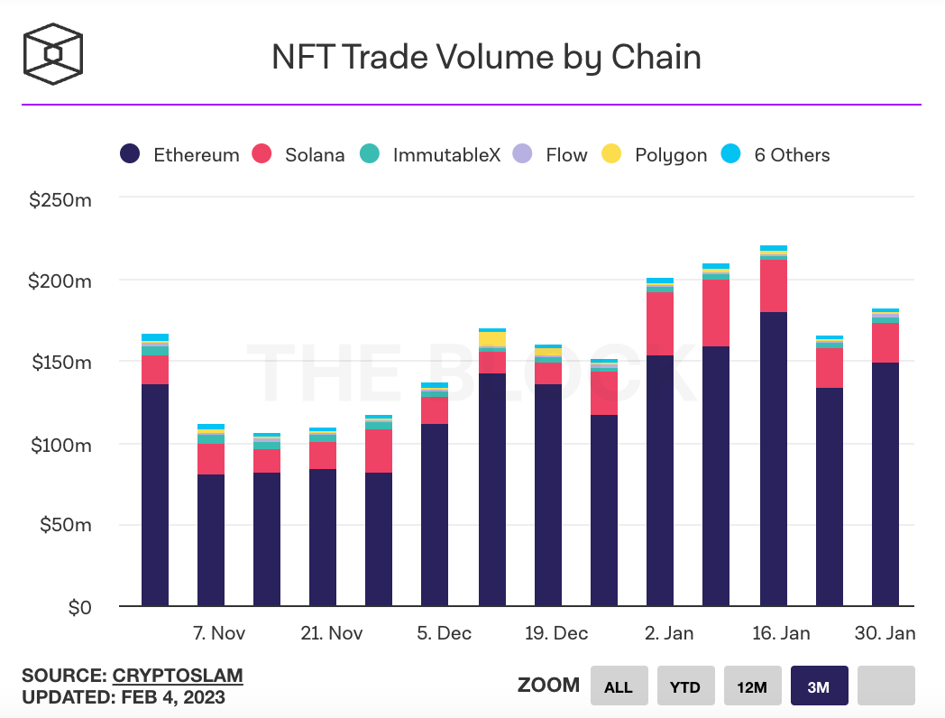 - NFT sales in January rose to $947 million, a 38% increase from $684 million in December. $772 million of volume in January happened on the Ethereum network, and $495 million was traded on the OpenSea marketplace. Link. Link.